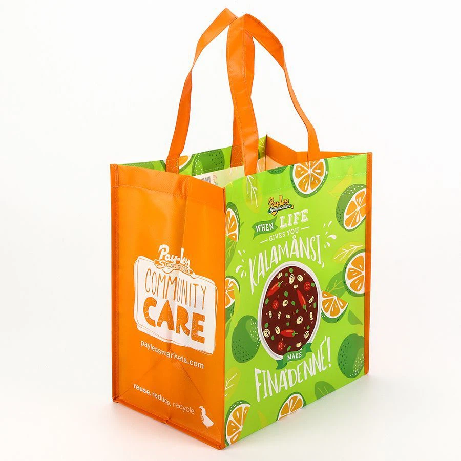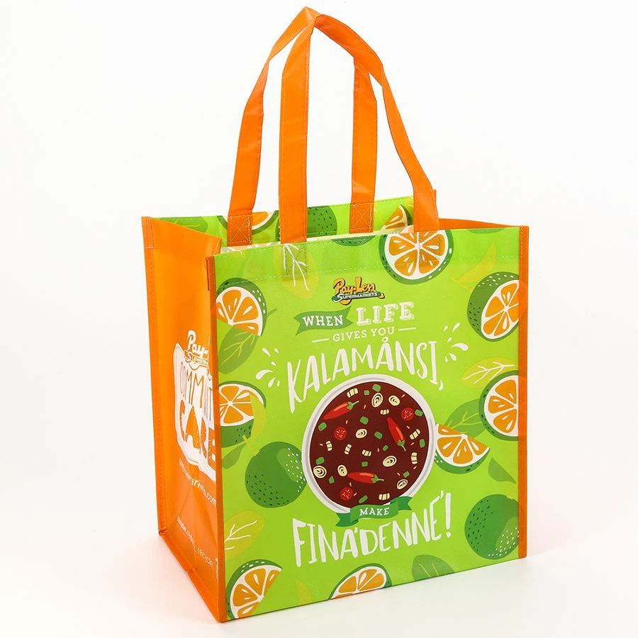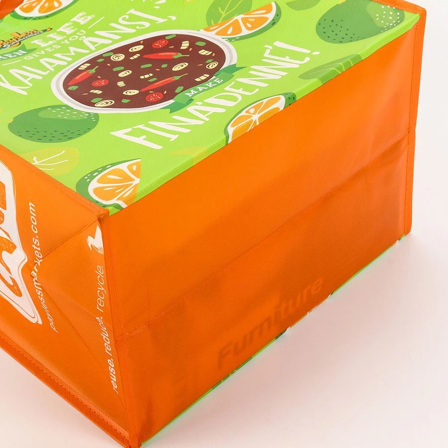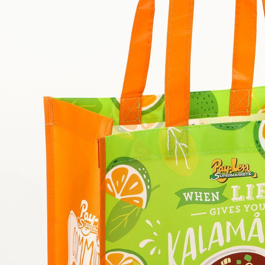 En laminert PP non-woven bag gjør en ideell reklameveske. Bopp laminerte ikke-vevde poser er vann- og blekningsbestandige, resirkulerbare og har bare halvparten av karbonfotavtrykket til papirposer. En laminert PP non-woven veske kan skrives perfekt ut og viser svært livlige farger og absolutt fotorealistiske resultater. Trykkmotiver fremstår veldig naturtro, matmotiver ser friske og appetittvekkende ut.